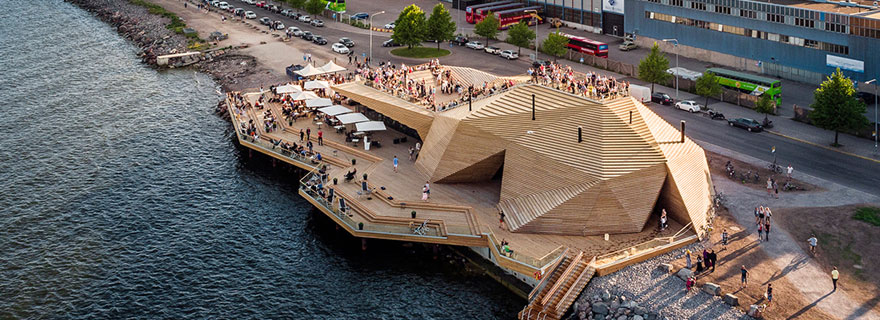 Esta construido con Nextimber, una tecnología de puesta en marcha que convierte los residuos de madera en paneles de madera, para que el edificio lo más ecológica posible y como resultado, Löyly es el primer proyecto en Finlandia para obtener la certificación del Consejo de Administración Forestal. Cuenta con un diseño en forma de concha que ha sido descrito como un «tunturi» – la palabra finlandesa para algo entre una colina y una montaña (que se destaca en el terreno plano típico de Finlandia). Y la palabra «Löyly» se traduce como el vapor que irradia de las rocas cuando se lanza agua sobre las piedras calientes en la sauna y en Finlandes antiguo como «espíritu» o «vida».